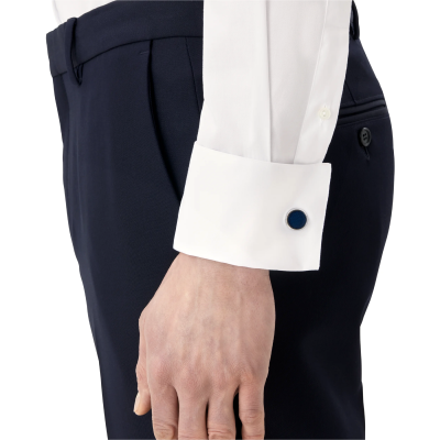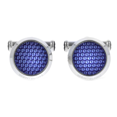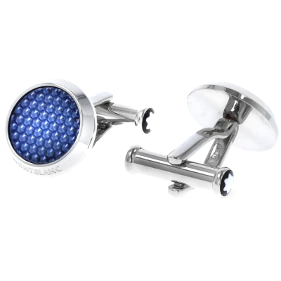Cufflinks are made in stainless steel inlaid with blue textured lacquer.